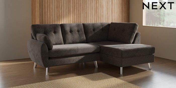 7.2.10 Wilson Buttoned Back Medium Corner Chaise - Right Hand Chunky Chenille Mink Brown Metal Tapered - Chrome | Made Click here to use our website with more accessibility support, for example screen readers