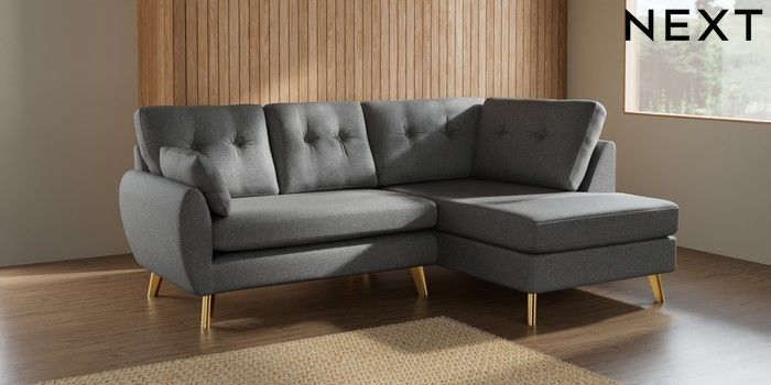 7.2.10 Wilson Buttoned Back Medium Corner Chaise - Right Hand Chunky Weave Mid Grey Metal Tapered - Gold | Made Click here to use our website with more accessibility support, for example screen readers