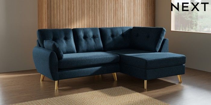 7.2.10 Wilson Buttoned Back Medium Corner Chaise - Right Hand Cotswold Chenille Dark Blue Metal Tapered - Gold | Made Click here to use our website with more accessibility support, for example screen readers