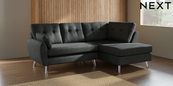 7.2.10 Wilson Buttoned Back Medium Corner Chaise - Right Hand Cotswold Chenille Dark Grey Metal Tapered - Chrome | Made Click here to use our website with more accessibility support, for example screen readers