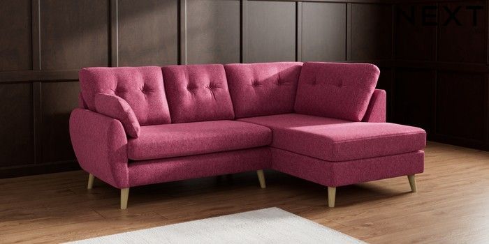 7.2.10 Wilson Buttoned Back Medium Corner Chaise - Right Hand Cotswold Chenille Dark Raspberry Pink Retro Tapered - Light | Made Click here to use our website with more accessibility support, for example screen readers
