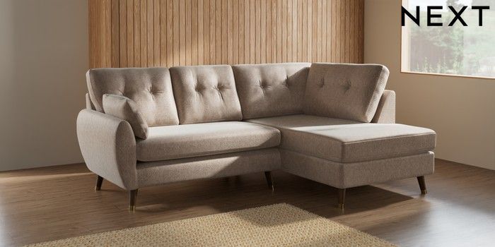 7.2.10 Wilson Buttoned Back Medium Corner Chaise - Right Hand Cotswold Chenille Light Natural Low Retro Tapered Metal Cap - Mid | Made Click here to use our website with more accessibility support, for example screen readers