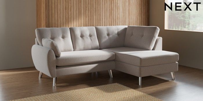 7.2.10 Wilson Buttoned Back Medium Corner Chaise - Right Hand Cotswold Chenille Oyster Metal Tapered - Chrome | Made Click here to use our website with more accessibility support, for example screen readers