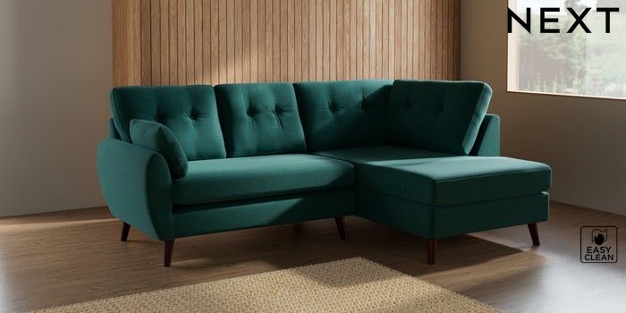 7.2.10 Wilson Buttoned Back Medium Corner Chaise - Right Hand Fine Chenille Easy Clean Dark Juniper Green Retro Tapered - Dark Brown | Made Click here to use our website with more accessibility support, for example screen readers