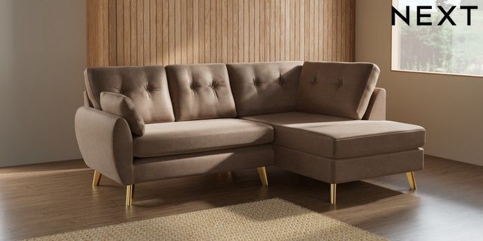 7.2.10 Wilson Buttoned Back Medium Corner Chaise - Right Hand Luxe Chenille Mid Natural Metal Tapered - Gold | Made Click here to use our website with more accessibility support, for example screen readers