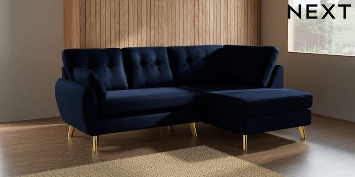 7.2.10 Wilson Buttoned Back Medium Corner Chaise - Right Hand Luxe Chenille Navy Blue Metal Tapered - Gold | Made Click here to use our website with more accessibility support, for example screen readers