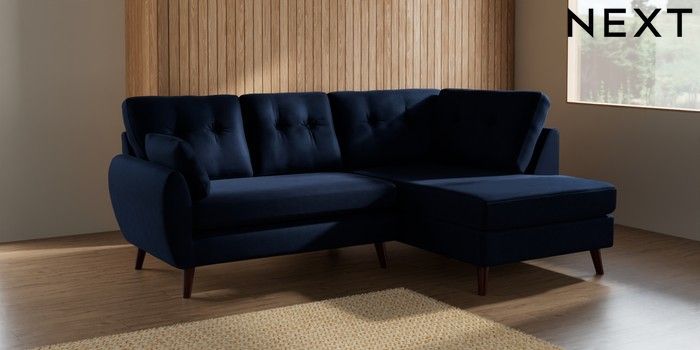 7.2.10 Wilson Buttoned Back Medium Corner Chaise - Right Hand Luxe Chenille Navy Blue Retro Tapered - Dark Brown | Made Click here to use our website with more accessibility support, for example screen readers