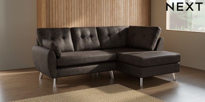 7.2.10 Wilson Buttoned Back Medium Corner Chaise - Right Hand Plush Chenille Mink Brown Metal Tapered - Chrome | Made Click here to use our website with more accessibility support, for example screen readers