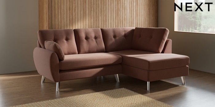 7.2.10 Wilson Buttoned Back Medium Corner Chaise - Right Hand Relaxed Linen Look Light Rust Brown Metal Tapered - Chrome | Made Click here to use our website with more accessibility support, for example screen readers