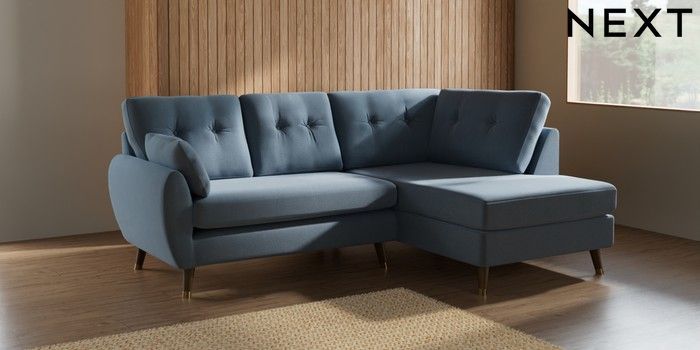 7.2.10 Wilson Buttoned Back Medium Corner Chaise - Right Hand Relaxed Linen Look Mid Blue Low Retro Tapered Metal Cap - Mid | Made Click here to use our website with more accessibility support, for example screen readers