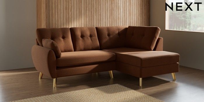 7.2.10 Wilson Buttoned Back Medium Corner Chaise - Right Hand Ripple Chenille Mid Rust Brown Metal Tapered - Gold | Made Click here to use our website with more accessibility support, for example screen readers