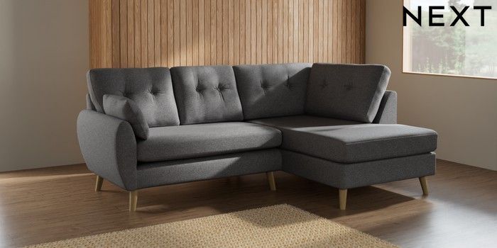 7.2.10 Wilson Buttoned Back Medium Corner Chaise - Right Hand Studio Chenille Mid Grey Retro Tapered - Light | Made Click here to use our website with more accessibility support, for example screen readers