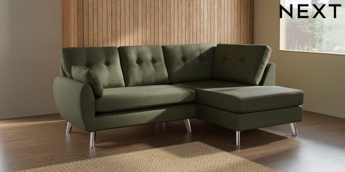 7.2.10 Wilson Buttoned Back Medium Corner Chaise - Right Hand Tweedy Chenille Mid Moss Green Metal Tapered - Chrome | Made Click here to use our website with more accessibility support, for example screen readers