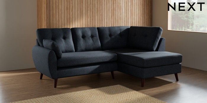 7.2.10 Wilson Buttoned Back Medium Corner Chaise - Right Hand Tweedy Chenille Navy Blue Retro Tapered - Dark Brown | Made Click here to use our website with more accessibility support, for example screen readers