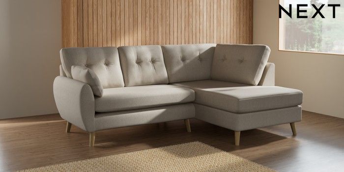7.2.10 Wilson Buttoned Back Medium Corner Chaise - Right Hand Tweedy Chenille Oyster Retro Tapered - Light | Made Click here to use our website with more accessibility support, for example screen readers