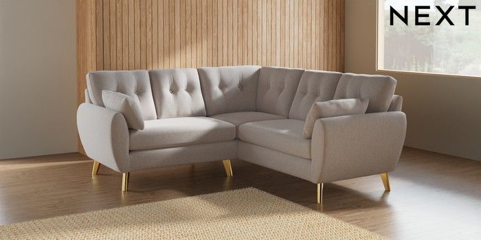 7.2.10 Wilson Buttoned Back Small Corner Sofa - Universal Cotswold Chenille Oyster Metal Tapered - Gold | Made Click here to use our website with more accessibility support, for example screen readers