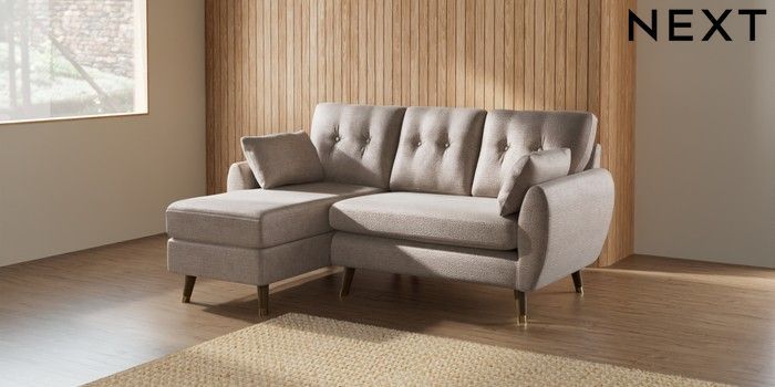 7.2.10 Wilson Buttoned Back Small Sofa Chaise - Left Hand Boucle Chenille Light Natural Low Retro Tapered Metal Cap - Mid | Made Click here to use our website with more accessibility support, for example screen readers