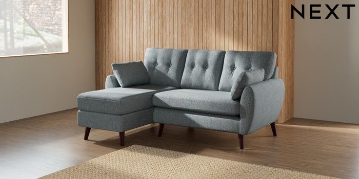 7.2.10 Wilson Buttoned Back Small Sofa Chaise - Left Hand Chunky Weave Mid Blue Retro Tapered - Dark Brown | Made Click here to use our website with more accessibility support, for example screen readers