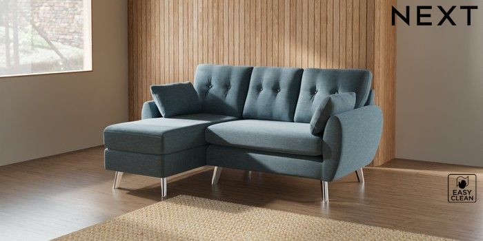 7.2.10 Wilson Buttoned Back Small Sofa Chaise - Left Hand Fine Chenille Easy Clean Mid Blue Metal Tapered - Chrome | Made Click here to use our website with more accessibility support, for example screen readers