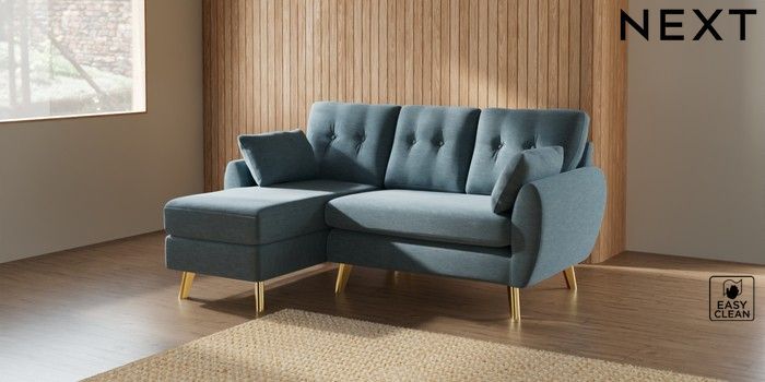 7.2.10 Wilson Buttoned Back Small Sofa Chaise - Left Hand Fine Chenille Easy Clean Mid Blue Metal Tapered - Gold | Made Click here to use our website with more accessibility support, for example screen readers