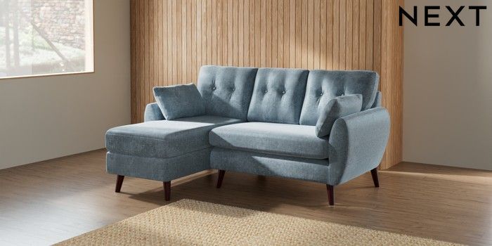 7.2.10 Wilson Buttoned Back Small Sofa Chaise - Left Hand Plush Chenille Light Blue Retro Tapered - Dark Brown | Made Click here to use our website with more accessibility support, for example screen readers