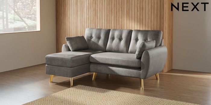 7.2.10 Wilson Buttoned Back Small Sofa Chaise - Left Hand Plush Chenille Light Grey Metal Tapered - Gold | Made Click here to use our website with more accessibility support, for example screen readers
