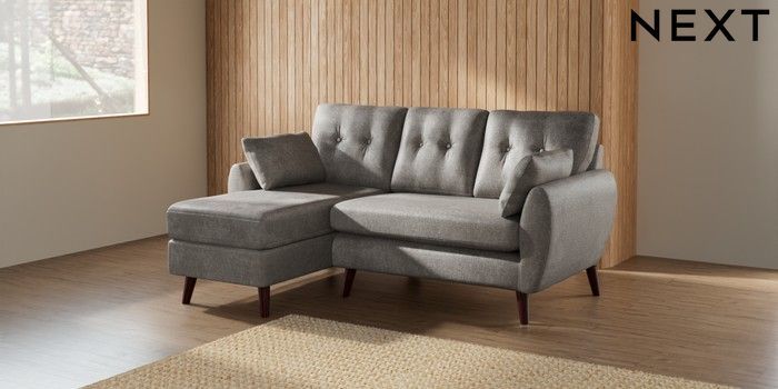 7.2.10 Wilson Buttoned Back Small Sofa Chaise - Left Hand Plush Chenille Light Grey Retro Tapered - Dark Brown | Made Click here to use our website with more accessibility support, for example screen readers