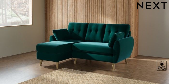 7.2.10 Wilson Buttoned Back Small Sofa Chaise - Left Hand Plush Velvet Easy Clean Juniper Green Retro Tapered - Light | Made Click here to use our website with more accessibility support, for example screen readers