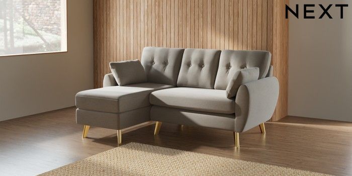 7.2.10 Wilson Buttoned Back Small Sofa Chaise - Left Hand Ripple Chenille Light Natural Metal Tapered - Gold | Made Click here to use our website with more accessibility support, for example screen readers