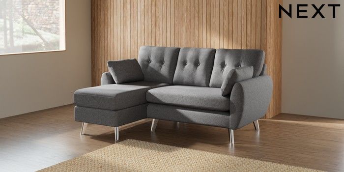 7.2.10 Wilson Buttoned Back Small Sofa Chaise - Left Hand Studio Chenille Mid Grey Metal Tapered - Chrome | Made Click here to use our website with more accessibility support, for example screen readers