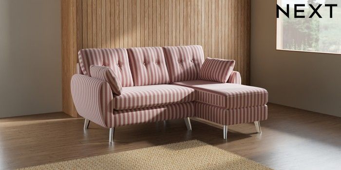7.2.10 Wilson Buttoned Back Small Sofa Chaise - Right Hand Bold Chenille Stripe Dark Pink Metal Tapered - Chrome | Made Click here to use our website with more accessibility support, for example screen readers