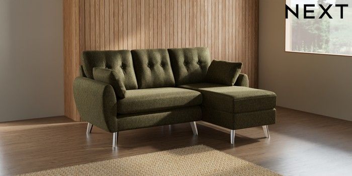 7.2.10 Wilson Buttoned Back Small Sofa Chaise - Right Hand Cotswold Chenille Dark Green Metal Tapered - Chrome | Made Click here to use our website with more accessibility support, for example screen readers