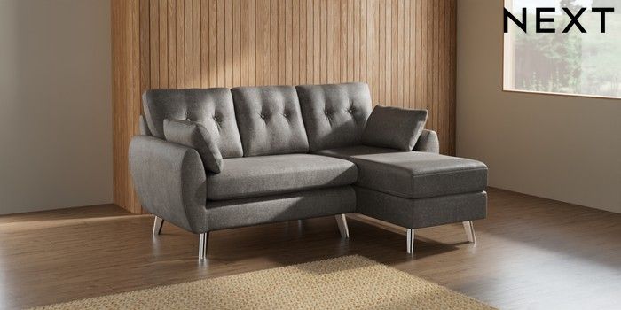 7.2.10 Wilson Buttoned Back Small Sofa Chaise - Right Hand Plush Chenille Light Grey Metal Tapered - Chrome | Made Click here to use our website with more accessibility support, for example screen readers