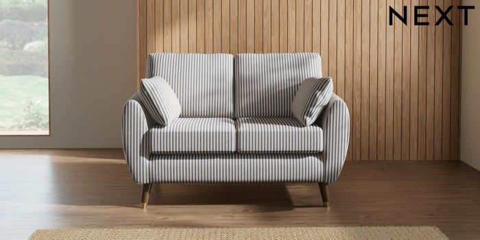 7.2.10 Wilson 2 Seater Small Sofa Chenille Stripe Slate Blue Low Retro Tapered Metal Cap - Mid | Made Click here to use our website with more accessibility support, for example screen readers