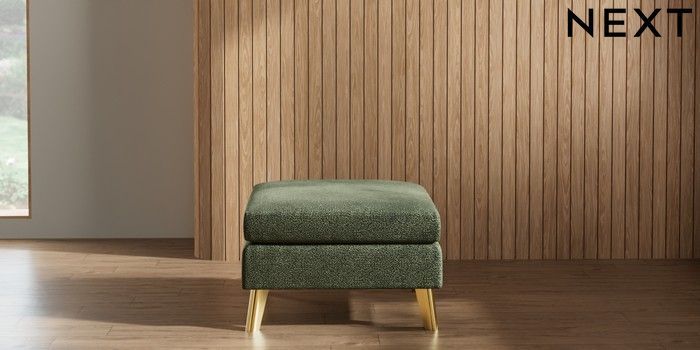 7.2.10 Wilson Footstool Boucle Chenille Dark Moss Green Metal Tapered - Gold | Made Click here to use our website with more accessibility support, for example screen readers
