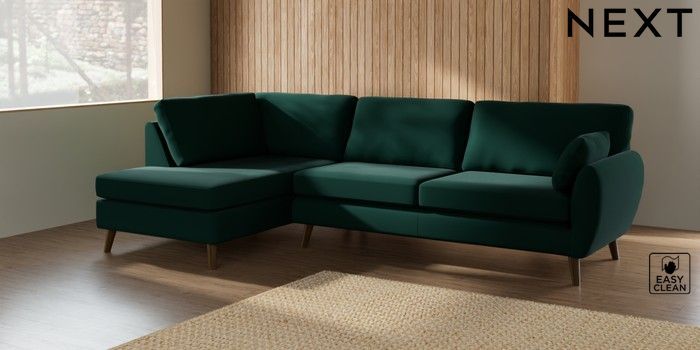 7.2.10 Wilson Large Corner Chaise - Left Hand Plush Velvet Easy Clean Bottle Green Retro Tapered - Mid | Made Click here to use our website with more accessibility support, for example screen readers