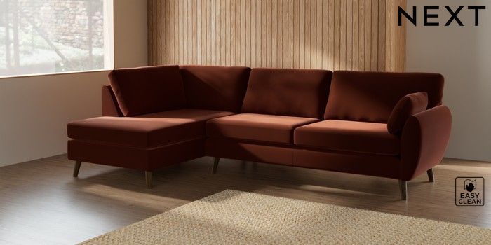 7.2.10 Wilson Large Corner Chaise - Left Hand Plush Velvet Easy Clean Ginger Orange Retro Tapered - Mid | Made Click here to use our website with more accessibility support, for example screen readers