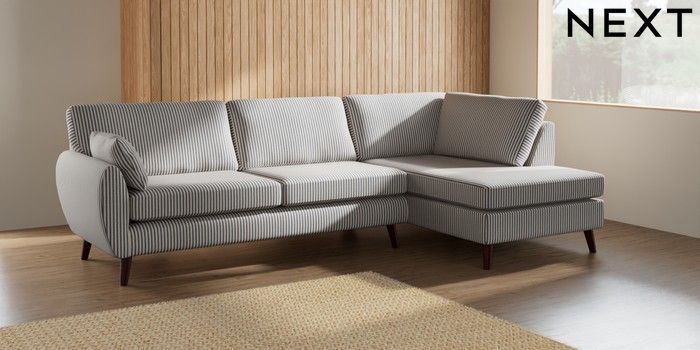 7.2.10 Wilson Large Corner Chaise - Right Hand Chenille Stripe Slate Blue Retro Tapered - Dark Brown | Made Click here to use our website with more accessibility support, for example screen readers