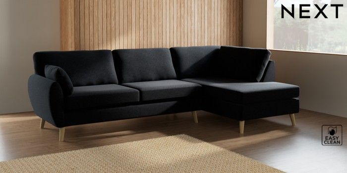 7.2.10 Wilson Large Corner Chaise - Right Hand Fine Chenille Easy Clean Black Retro Tapered - Light | Made Click here to use our website with more accessibility support, for example screen readers