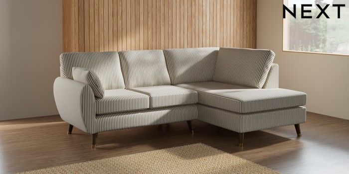 7.2.10 Wilson Medium Corner Chaise - Right Hand Chenille Stripe Moss Green Low Retro Tapered Metal Cap - Mid | Made Click here to use our website with more accessibility support, for example screen readers