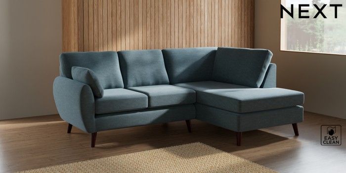 7.2.10 Wilson Medium Corner Chaise - Right Hand Fine Chenille Easy Clean Mid Blue Retro Tapered - Dark Brown | Made Click here to use our website with more accessibility support, for example screen readers