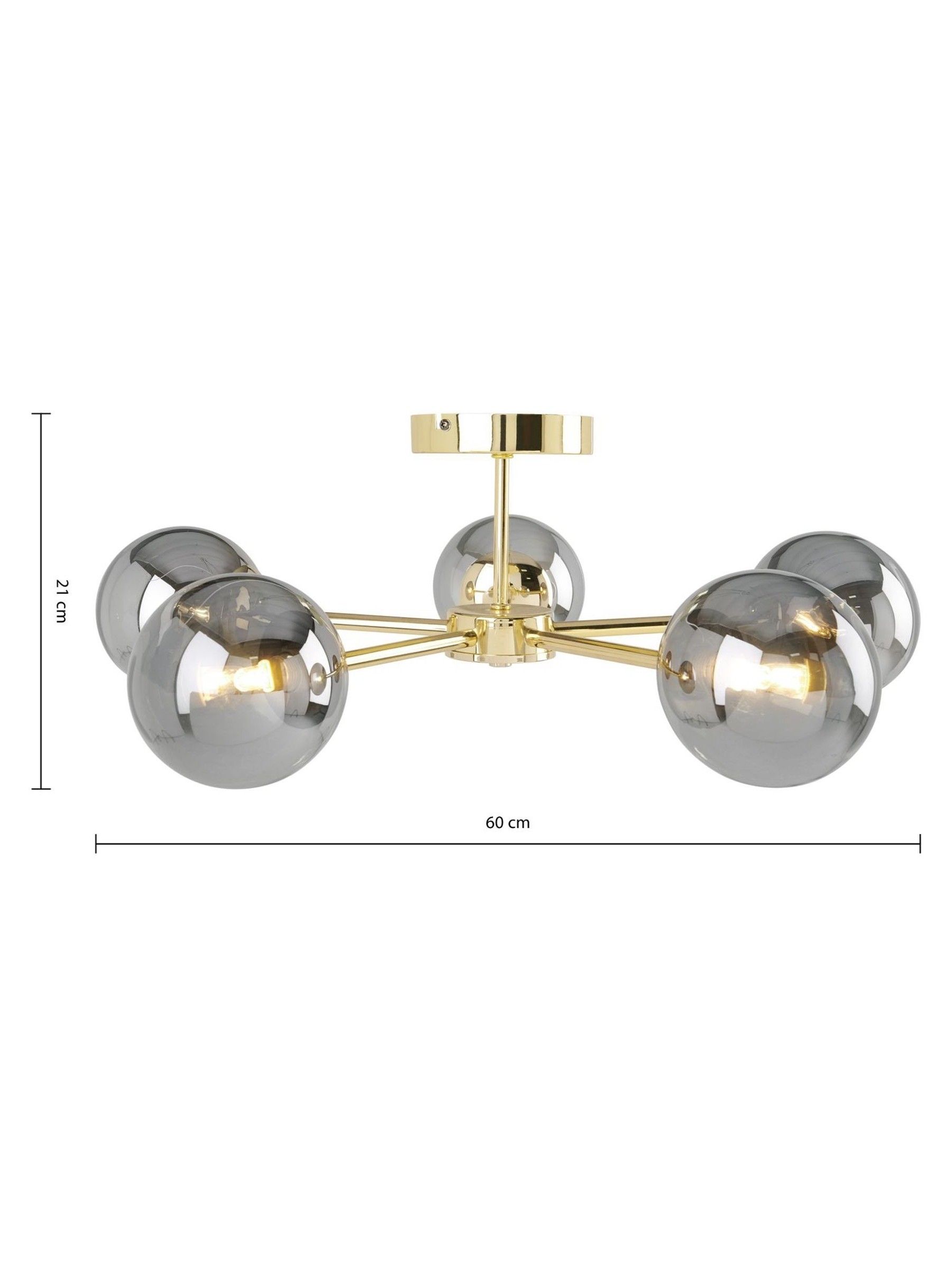 The ultimate investment piece, Globe will brighten up any lonely-looking room. Its design is the perfect height for walking under, and great for lower ceilings. Its structured frame supports five glass globes, hence the name, that help spread the light across your room. Product dimensionsHeight: 20.5cm Width: 59.5cm Depth: 59.5cmWeight: 1.7kgProduct detailsAssembly Required - YesNumber of Bulbs Required - 5/ G9 LED/ 7W LEDBulb(s) Included - NoDimmable - NoProfessional installation is recommended.Height Adjustable - NoCare instructionsWipe clean with a soft dry cloth only. Ensure the light is unplugged or switched off, and allowed to cool before cleaning. Height 20.5cm Diameter 59.5cm Click here for information on how to recycle your old electrical item. For Ireland: If this product contains an LED light bulb or luminaire, included in this price is a contribution to recycling costs of €0.05 80% Glass, 20% Metal. Click here to see assembly instructions