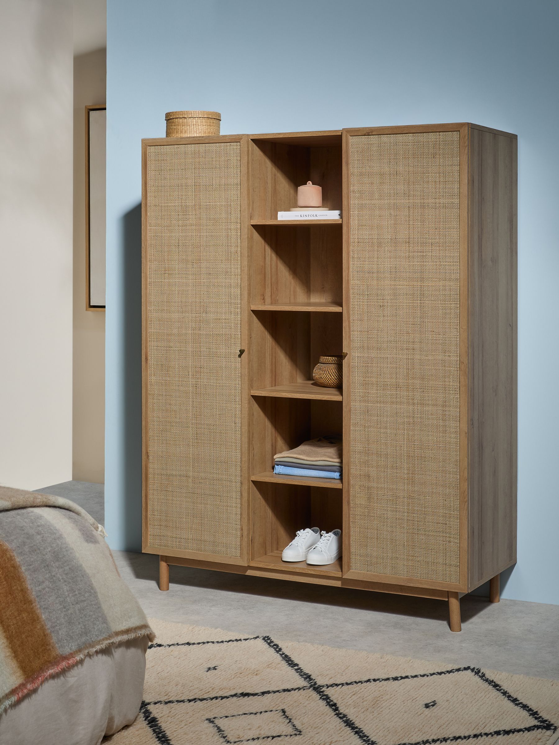 Casual, bohemian, and a little bit retro. Vintage-style woven doors, natural materials, and a handy, compact size. Pavia's ticking all our boxes. This wardrobe's as stylish as the clothes hanging inside – and you can pop your folded things in the open shelving.