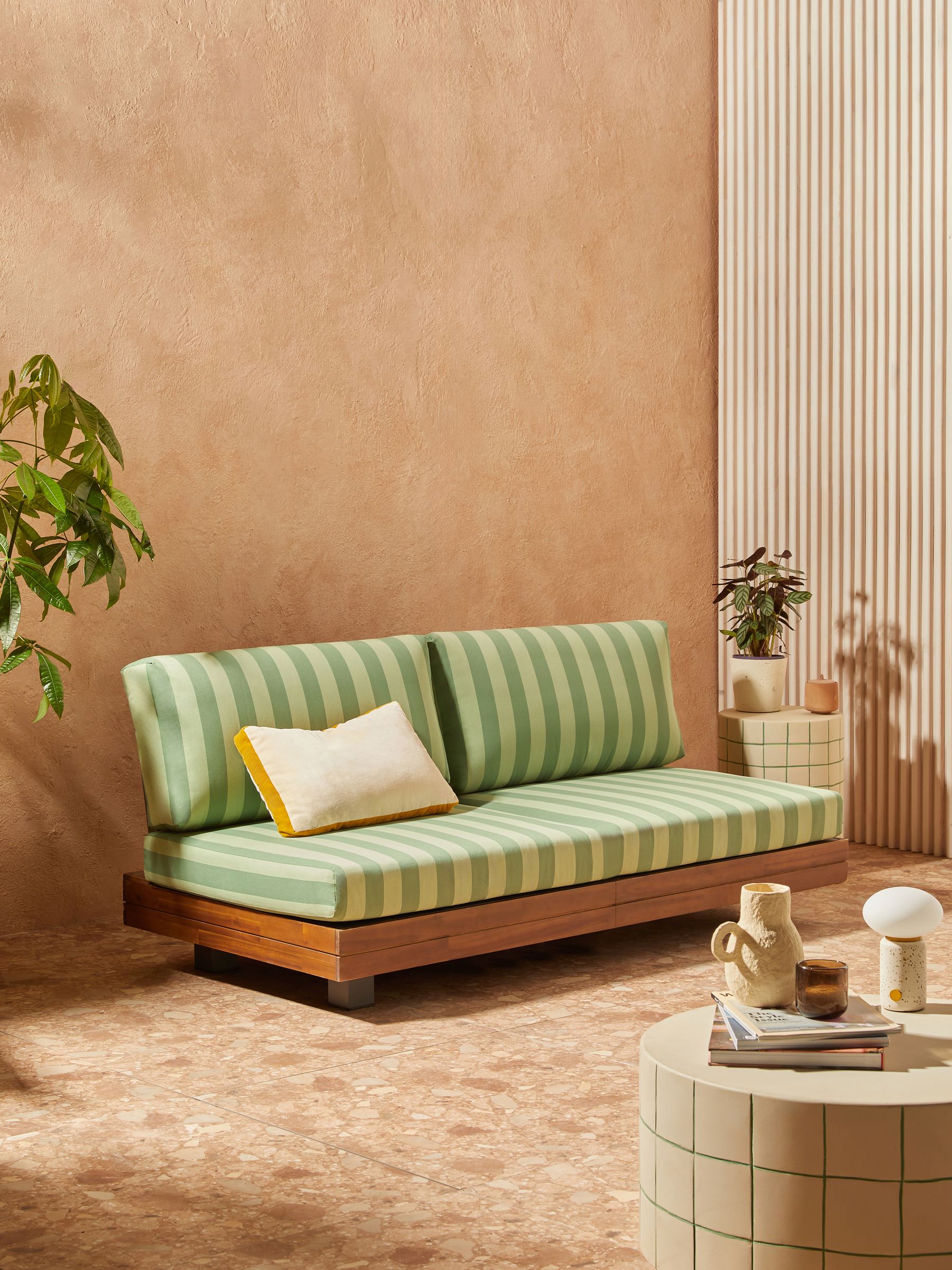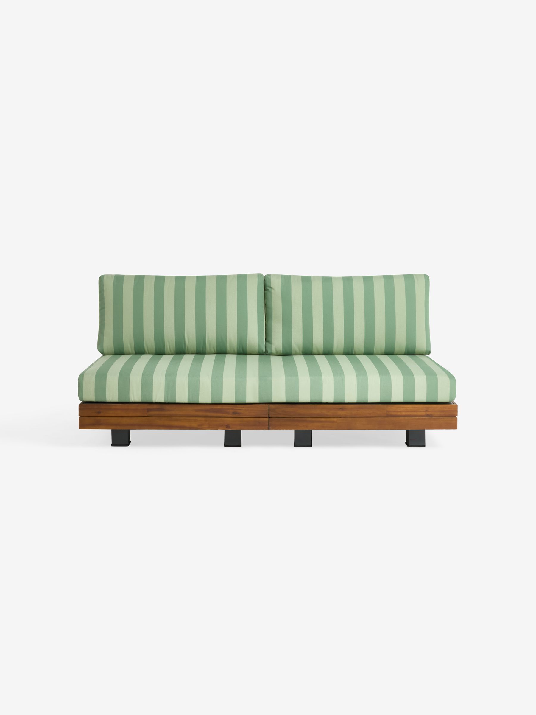 Want to get stylish in the garden? Avarna can help with that. Check out the chunky legs below and the acacia wood plinth base, all topped with green stripe cushions. Pour your favourite drink and get lounging. Cover or store away when not in use and bring cushions inside. Height 76cm Width 160cm Depth 83cm For top tips on how to care for your outdoor furniture, read our handy guide here Multibuy: Save 10% when buying 2 or more items each priced at £150 or above across selected Sofas, Chairs, Rugs, Beds, Mattresses and Furniture Collections. Multibuy is only applicable to the UK Mainland Area.* Condition: * Saving applied will be apportioned across all qualifying items. To get the saving, you must order the qualifying items in the same order at the same time. If you later return one of the items, you will not be entitled to the discount. Offer applies to selected items at full price. Please refer to T&Cs for full details. This product requires self-assembly. Regrettably, self-assembly items cannot be returned once assembly is part or fully completed, unless they do not comply with the description given, are faulty, or are not fit for any stated purpose. Your statutory rights are not affected., Larger products with this symbol will be delivered by Next Home Two Person Delivery, who will place the product in the room of your choice. Assembled furniture will be unwrapped. Cost for 2 man delivery, £15.00. If you order more than one, item we will only charge one fee. We deliver seven days a week except for bank holidays., We want you to love our furniture. So this piece comes with a 15 year guarantee that you can trust. Our 15 year Structural Guarantee covers your furniture against manufacturing faults or defects of the frame construction from the date of delivery. Exclusions apply, for more details see https://xcdn.next.co.uk/pdfs/buyingguide/15yrguarantee.pdf