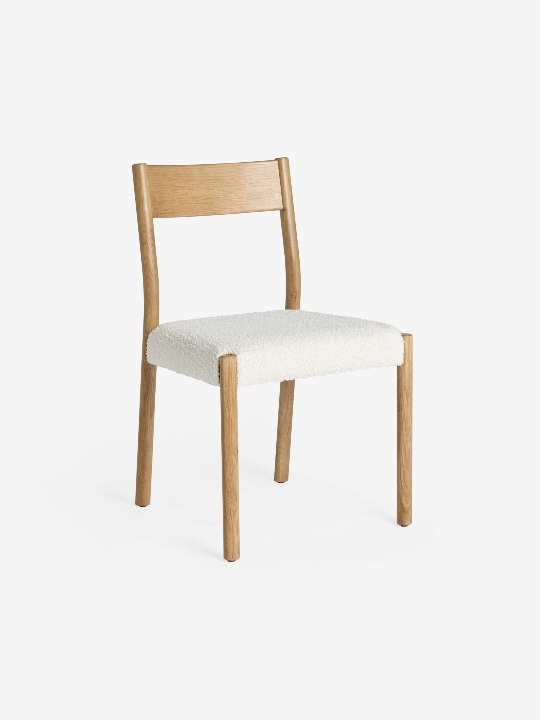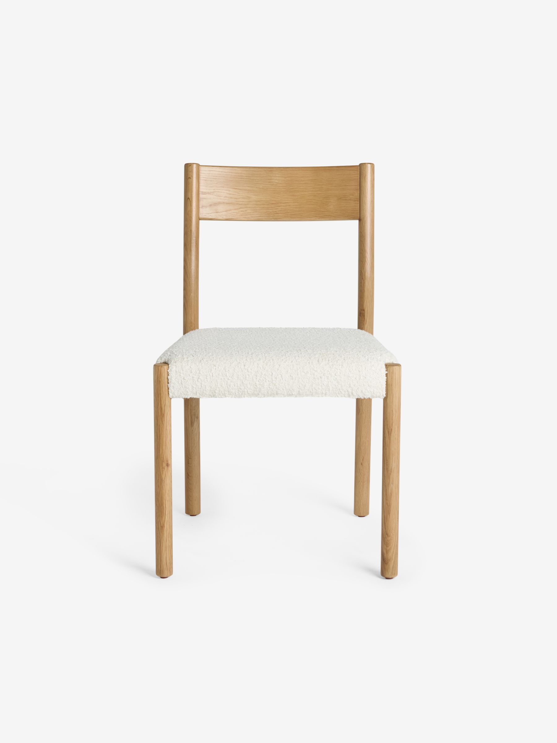 Traditional design, with a modern twist. Rhye's the best of both worlds. These chairs are defined by their clean lines, supportive curved backrest and beautifully textured off-white boucle seat. The light wood frame provides a contemporary yet warm aesthetic, making Rhye an effortless way to upgrade your dining space. So sleek.