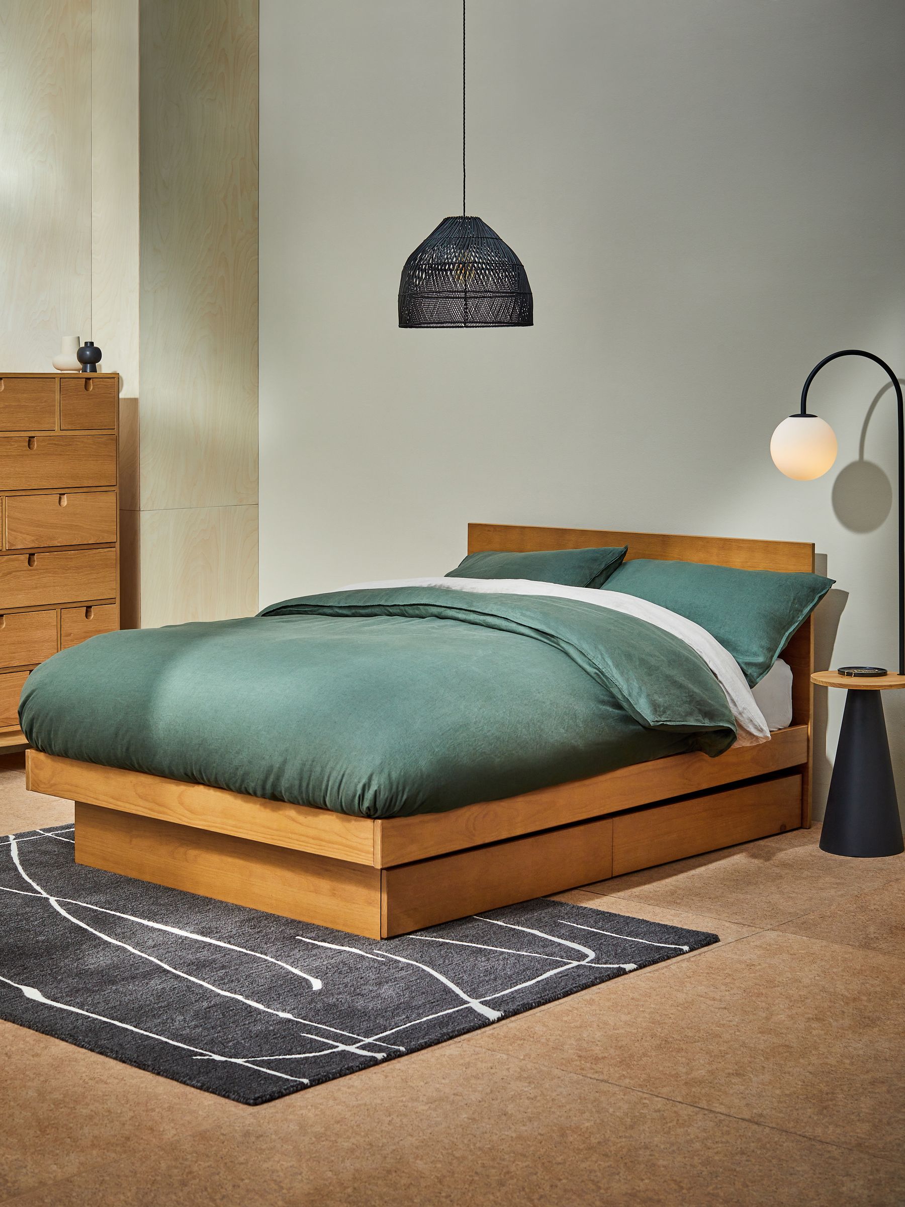 How did we achieve Meiko's floating effect? The plinth's nestled underneath. Clever, right? And those roomy drawers are pretty clever, too. This solid pine bed's inspired by Japanese interiors – minimal, zen and stylish. And now so are you.