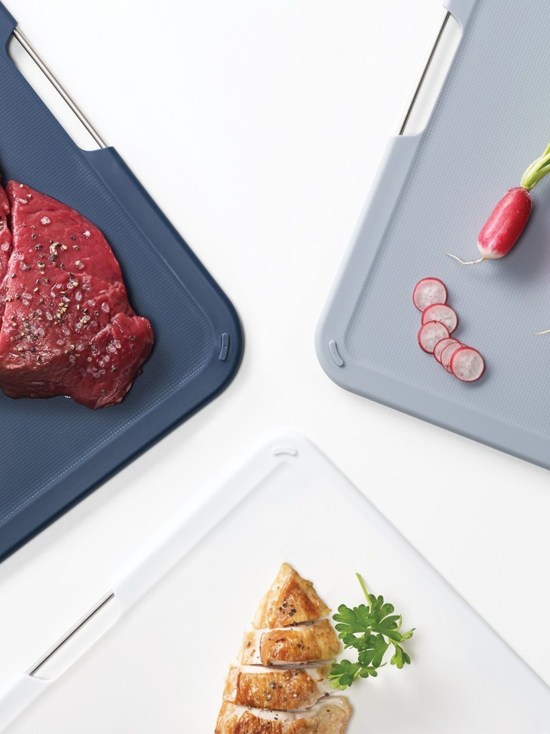 This smart set of colour-coded chopping boards comes with its own sleek storage stand, making the boards very easy to access and a stylish addition to any worktop. Each board is a different size, catering for a range of food prep tasks, and features an easy-lift stainless-steel bar, non-slip feet and a knife-friendly, textured cutting surface. The stand holds each board apart, allowing air to circulate for even drying, and includes non-slip feet on the base.