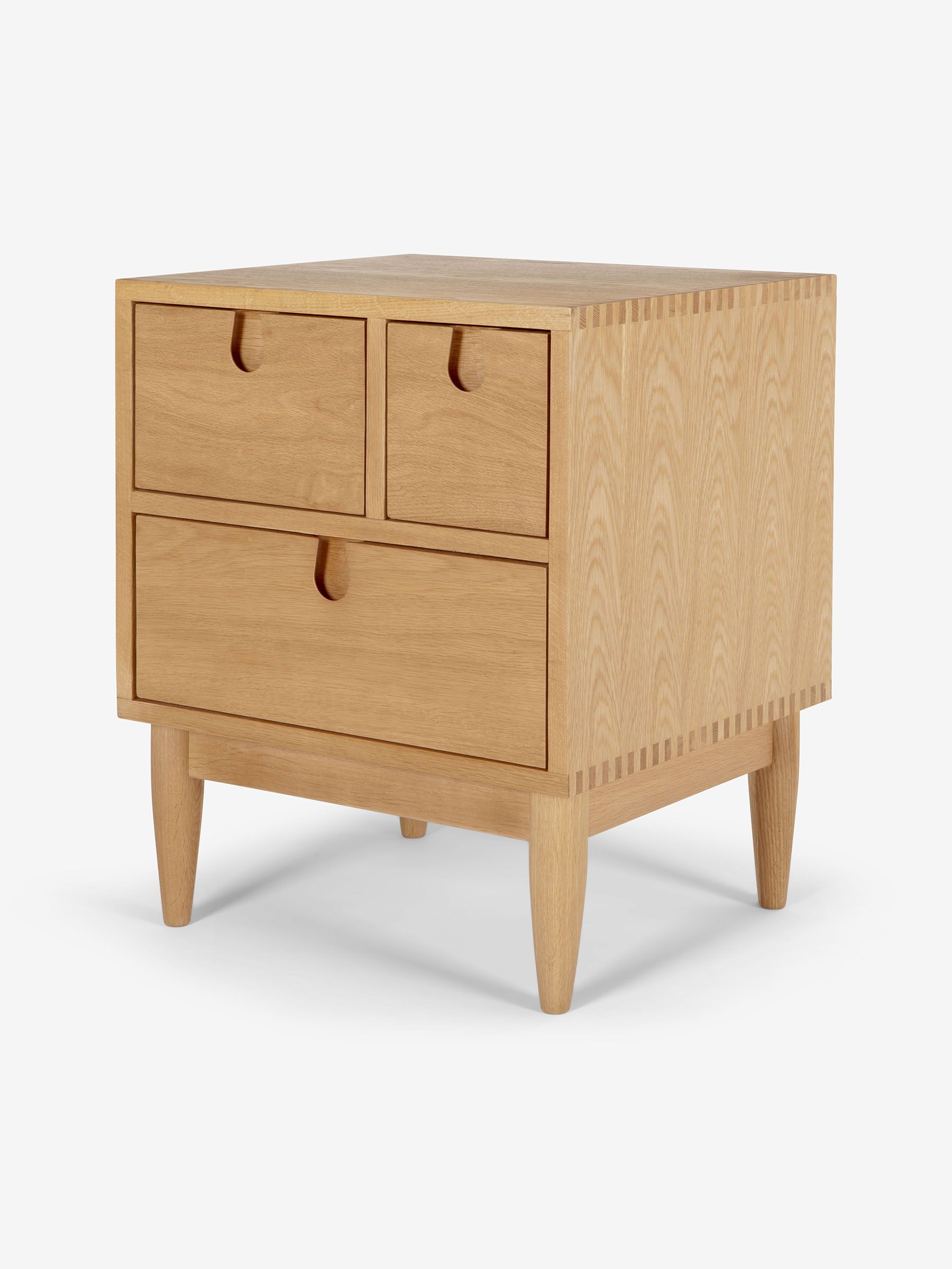 Penn is elegant and cool. Details are subtle but expressive and nothing has been overlooked. Crafted with clean lines, and solid oak tapered legs and posts. The Penn collection commands attention without demanding it. Subtle. Sophisticated. This Made Studio design is the foundation of a refined home setting. Spot the design details, like the tapered spindles and the oak skirt. The recessed handles add a modern, eye-catching feature while the finger-joint edges show off the solid construction. Solid oak 3 drawer design Recessed handles Height 55.5cm Width 45cm Depth 40cm Wipe clean only. Multibuy: Save 10% when buying 2 or more items each priced at £150 or above across selected Sofas, Chairs, Rugs, Beds, Mattresses and Furniture Collections. Multibuy is only applicable to the UK Mainland Area.* Condition: * Saving applied will be apportioned across all qualifying items. To get the saving, you must order the qualifying items in the same order at the same time. If you later return one of the items, you will not be entitled to the discount. Offer applies to selected items at full price. Please refer to T&Cs for full details. This product requires self-assembly. Regrettably, self-assembly items cannot be returned once assembly is part or fully completed, unless they do not comply with the description given, are faulty, or are not fit for any stated purpose. Your statutory rights are not affected.