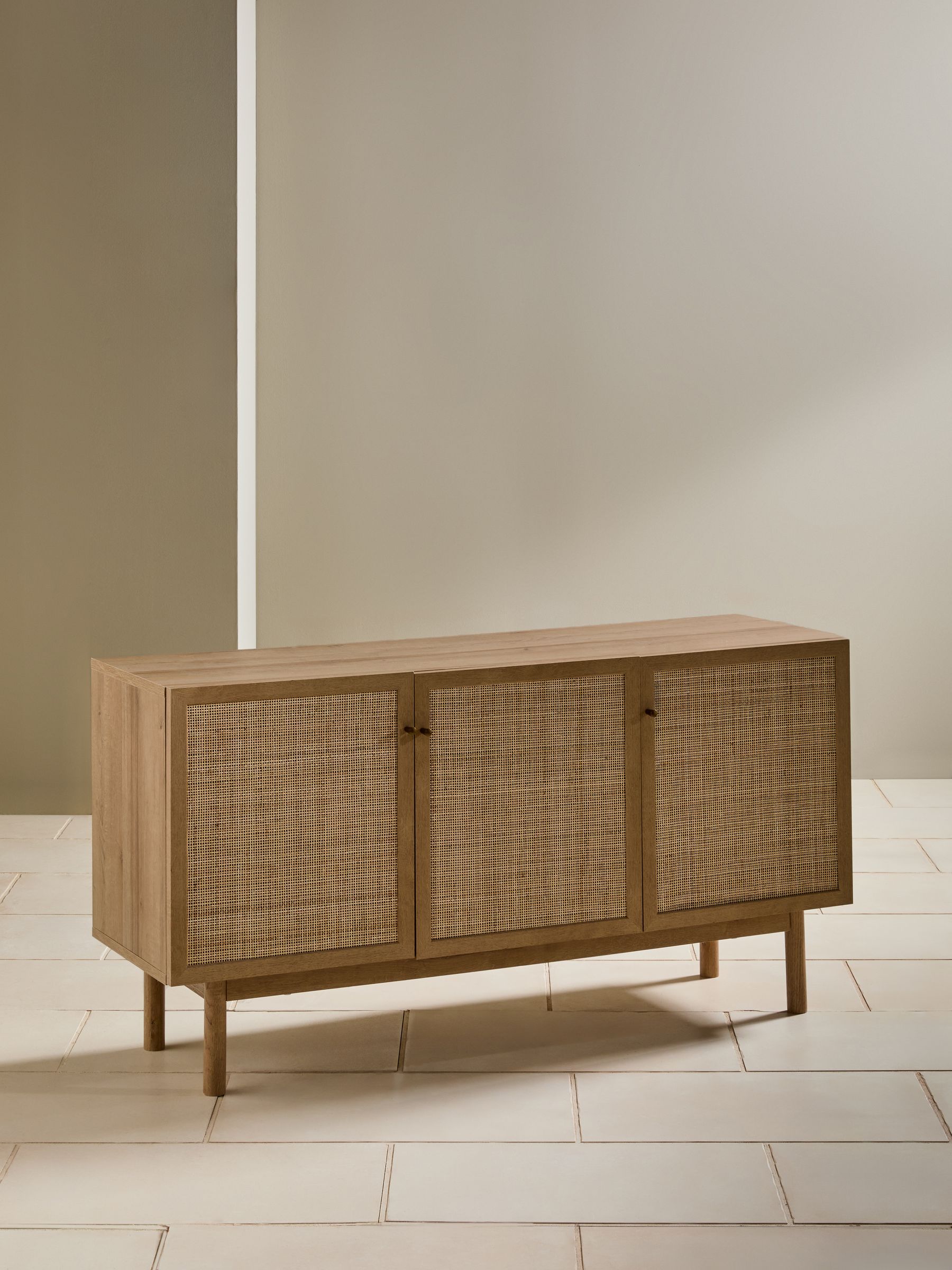 Casual, bohemian, with a lot of global influence. Vintage-style doors, oak-effect finish and a handy, compact size. Pavia's ticking all our boxes. This sideboard's perfect for storing everything, from books to plates. Height 70cm Width 136cm Depth 41cm Multibuy: Save 10% when buying 2 or more items each priced at £150 or above across selected Sofas, Chairs, Rugs, Beds, Mattresses and Furniture Collections. Multibuy is only applicable to the UK Mainland Area.* Condition: * Saving applied will be apportioned across all qualifying items. To get the saving, you must order the qualifying items in the same order at the same time. If you later return one of the items, you will not be entitled to the discount. Offer applies to selected items at full price. Please refer to T&Cs for full details. This product requires self-assembly. Regrettably, self-assembly items cannot be returned once assembly is part or fully completed, unless they do not comply with the description given, are faulty, or are not fit for any stated purpose. Your statutory rights are not affected., Larger products with this symbol will be delivered by Next Home Two Person Delivery, who will place the product in the room of your choice. Assembled furniture will be unwrapped. Cost for 2 man delivery, £15.00. If you order more than one, item we will only charge one fee. We deliver seven days a week except for bank holidays., We want you to love our furniture. So this piece comes with a 15 year guarantee that you can trust. Our 15 year Structural Guarantee covers your furniture against manufacturing faults or defects of the frame construction from the date of delivery. Exclusions apply, for more details see https://xcdn.next.co.uk/pdfs/buyingguide/15yrguarantee.pdf