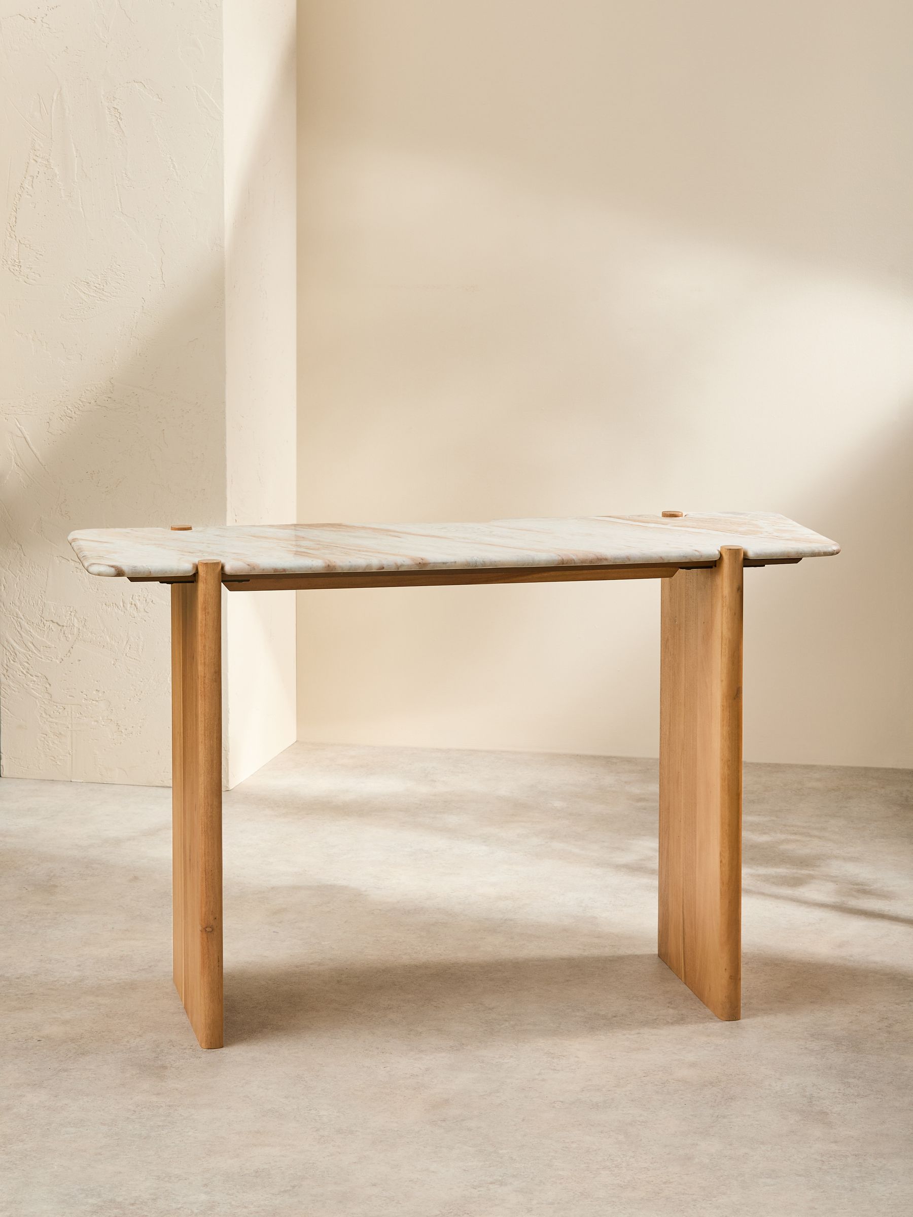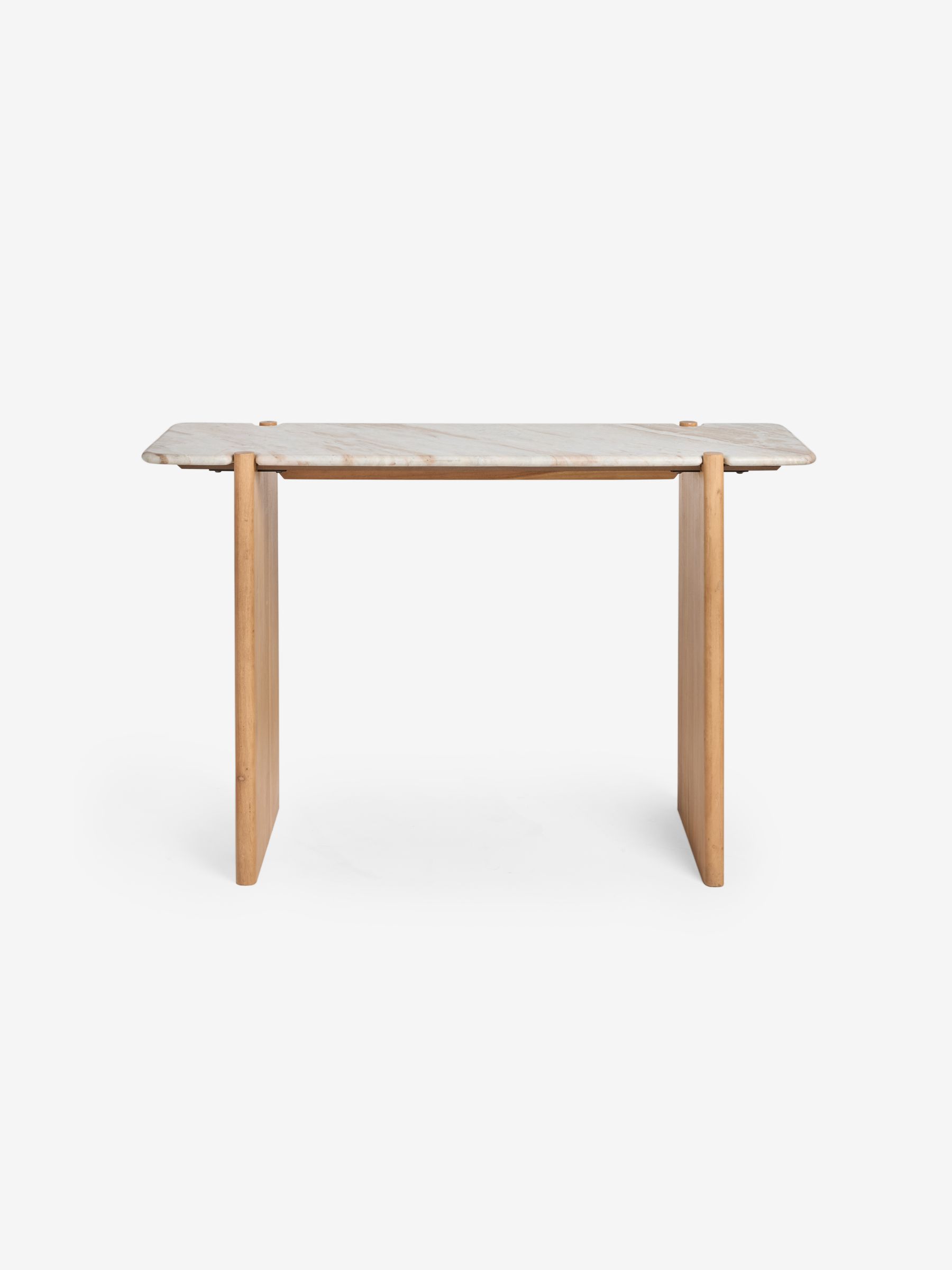 Callen is an elegant addition to your space. Featuring a smooth, natural marble top and sturdy wooden legs, providing a warm contrast to the cool stone. Its minimalist design and clean lines make it a versatile piece, perfect for hallways, living rooms, or small spaces. Display your favorite décor or use it as a stylish surface for everyday essentials.